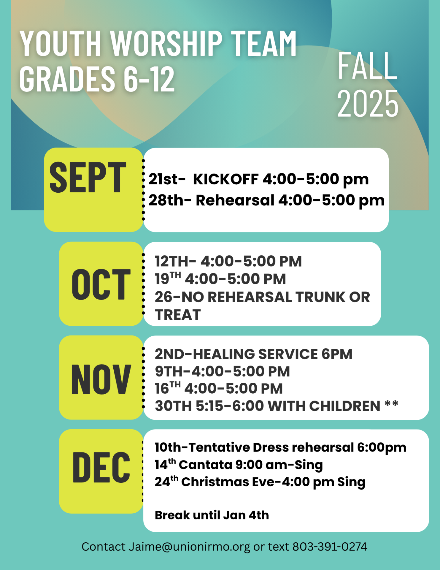 Confirmation classes run September thru April, with Rev. Faye Jones, and run in conjunction with Sunday Morning Youth Discipleship. Confirmands are encouraged to participate in all other Youth of Union activities.